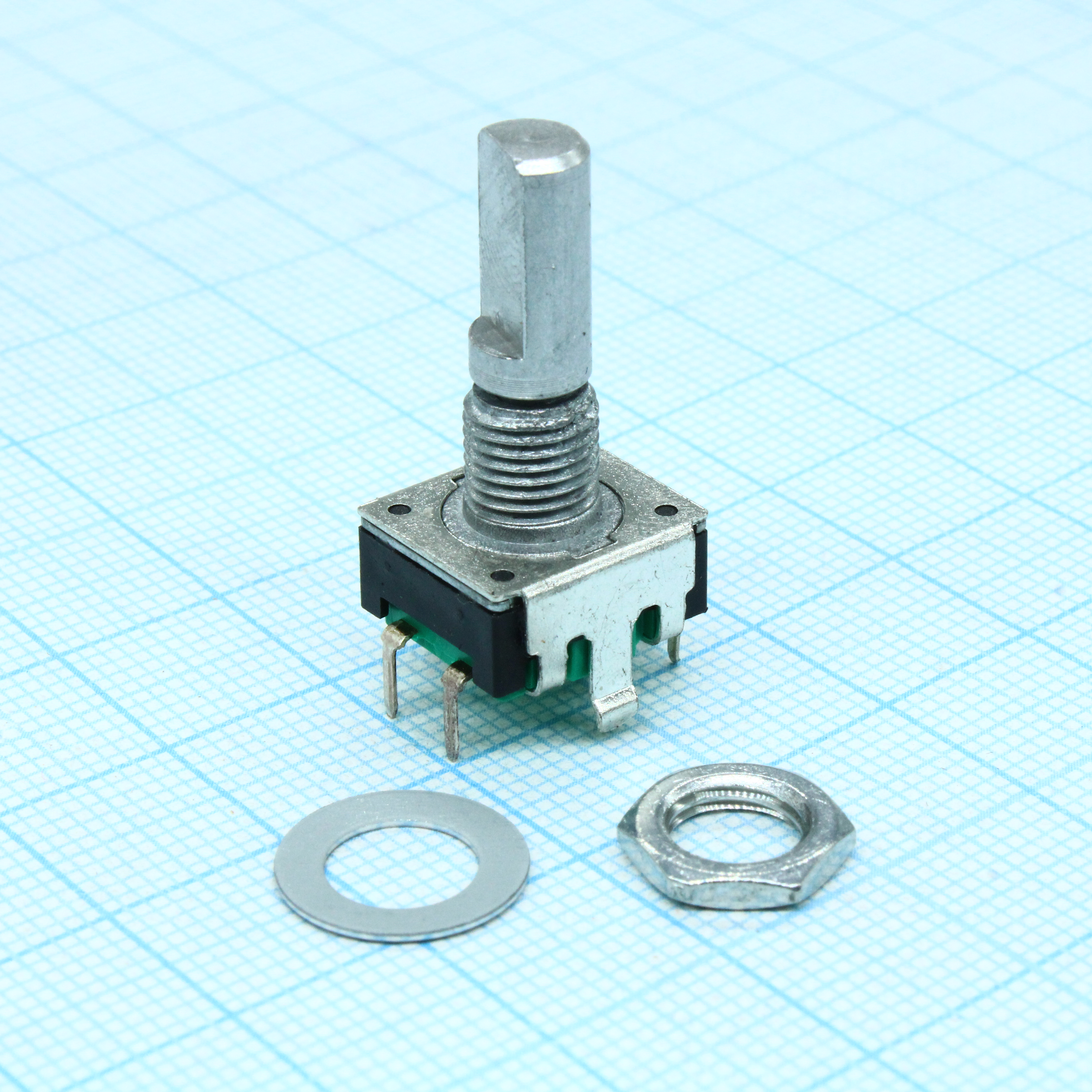 Энкодер PEC11, 24 щелчка, 12 импульсов, металлический вал с лыской 20мм, с кнопкой, горизонтальные выводы,крепление на гайку 7мм