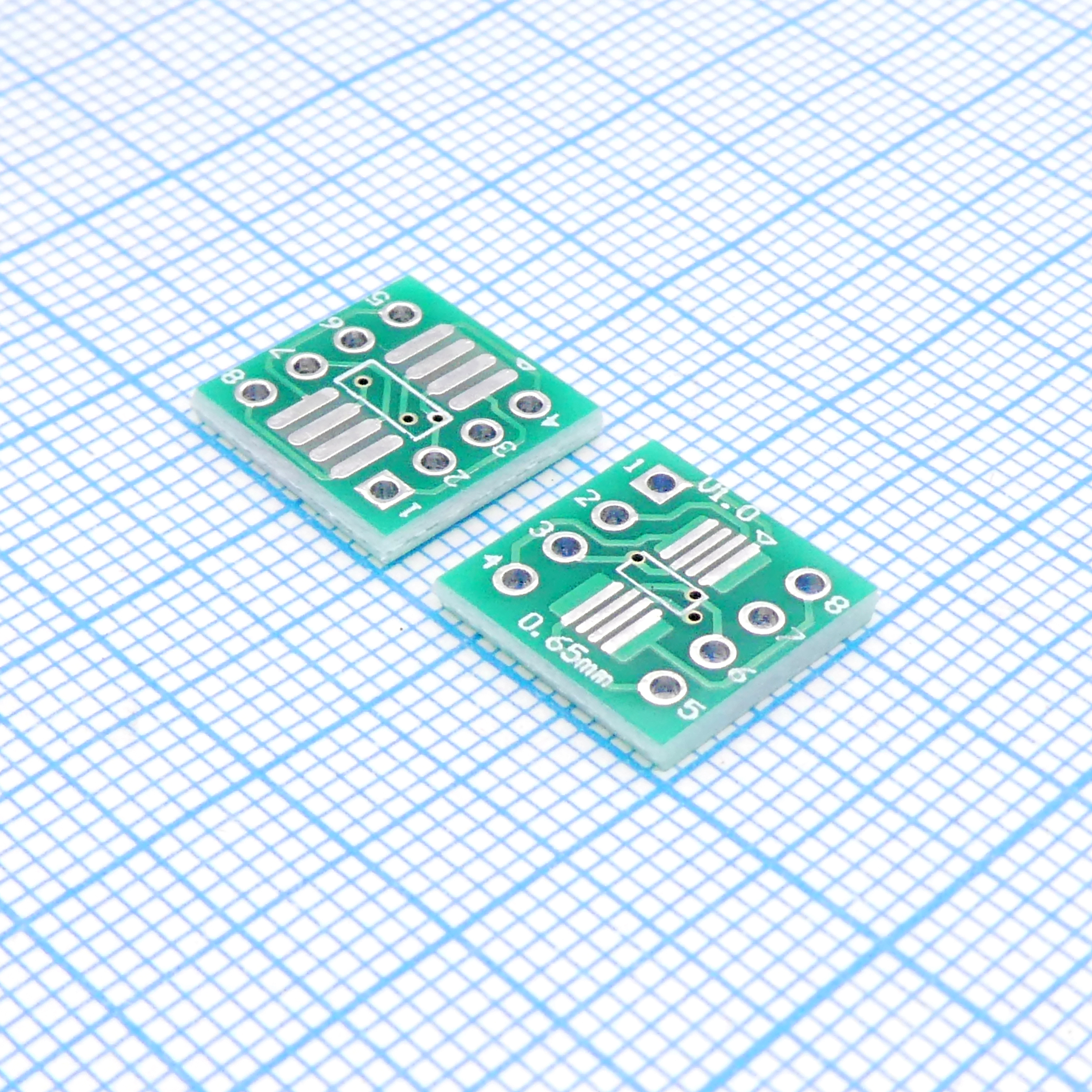 Плата SOIC-8 и SSOP-8 - Двухсторонняя плата с разводкой под SMD-корпуса SOIC-8 (150, 208 и 300 mil) и SSOP-8. С помощью ее можно с легкостью изготовить переходник на корпус DIP-8 с шагом 2,54 мм