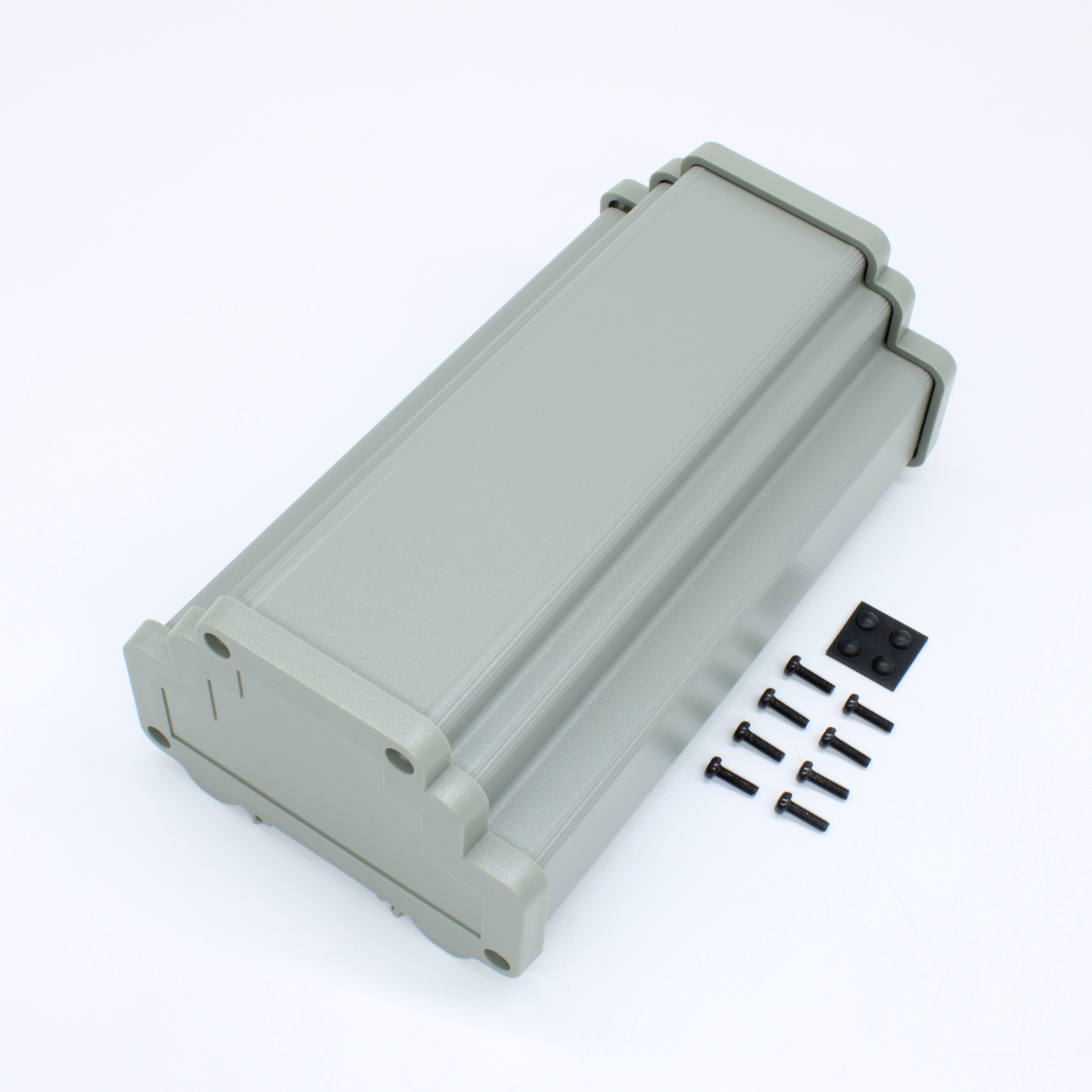Прочный корпус на DIN-рейку. В комплектацию входит алюминиевая база, торцевые панели из поликарбоната, винты и ножки.