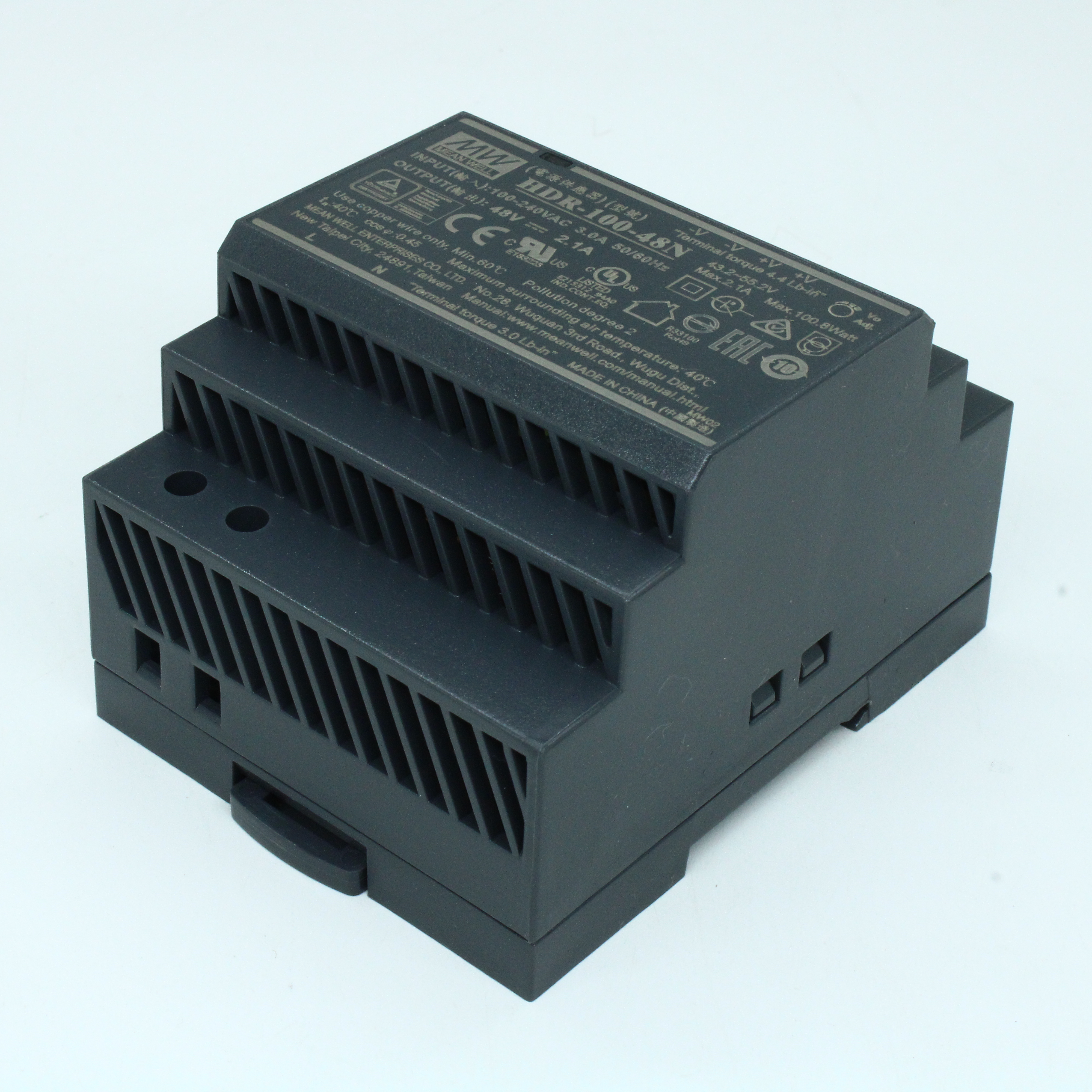 HDR-100-48N - AC-DC, 100.8Вт, вход 85...264 В AC 47...63Гц/120...370В DC, выход 48В/2.1А, рег. выхода 48…48.7В, изоляция 3000В AC, в кожухе на DIN-рейку, 70х90х54.5мм, -30...+70°С