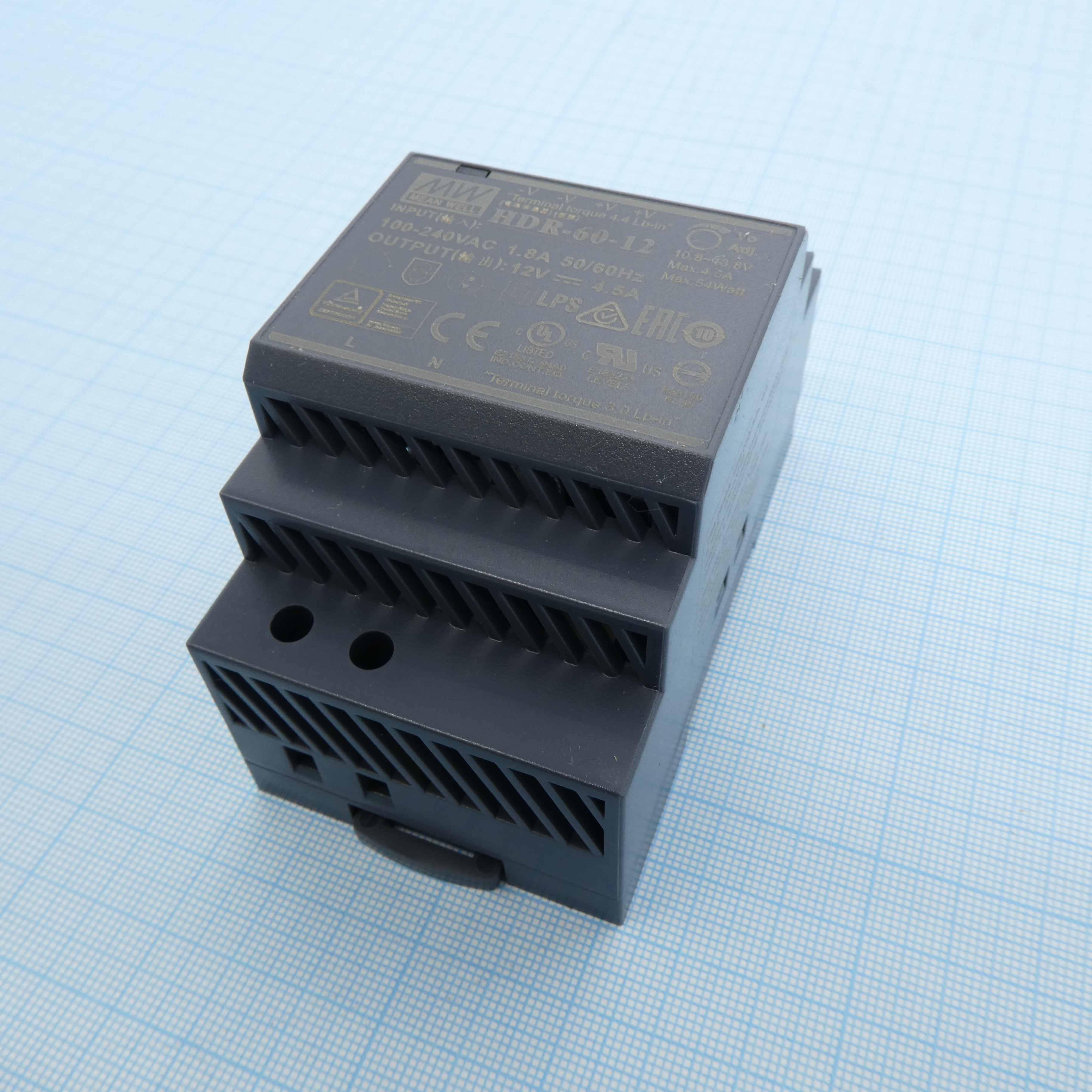 HDR-60-12 - AC-DC, 54Вт, вход 85...264 В AC 47...63Гц/120...370В DC, выход 12В/4.5А, изоляция 3000В AC, в кожухе на DIN-рейку, 52.5х90х54.5мм, -30...+70°С