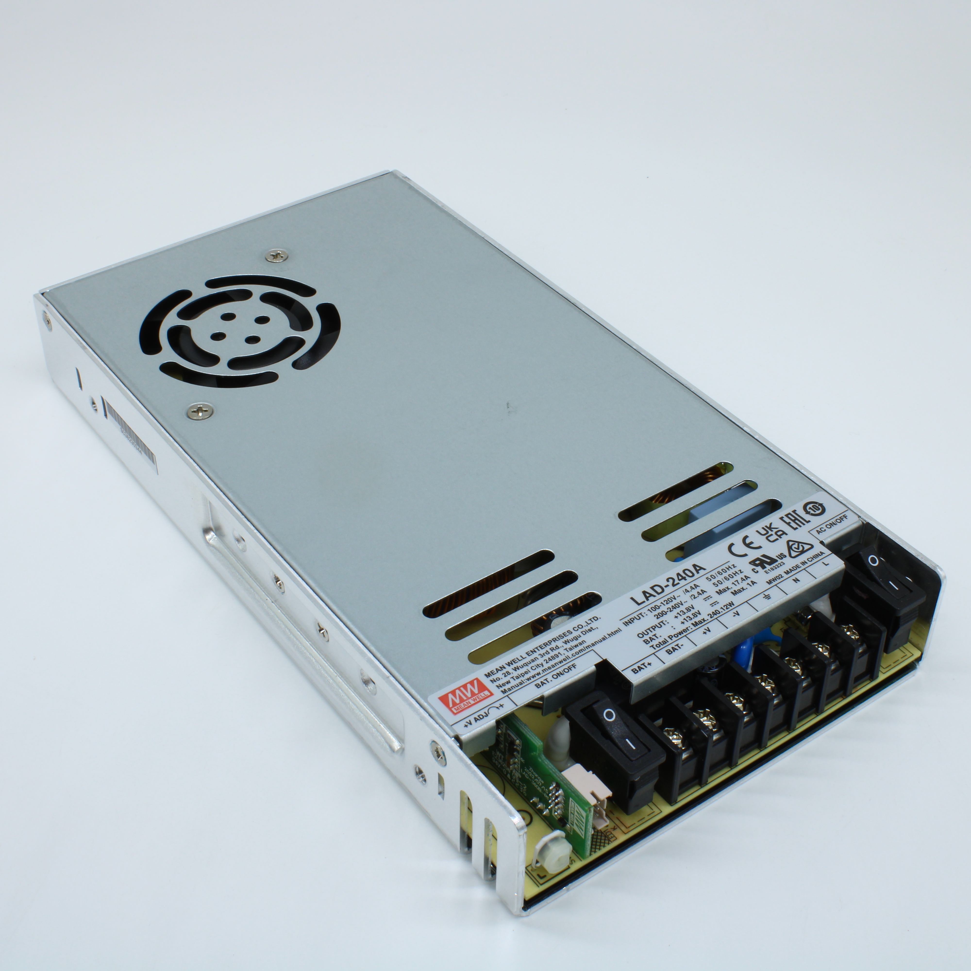 LAD-240A - AC-DC с функцией заряда АКБ, 240.12Вт, вход 90…132/180…264В AC, 47…63Гц /240…370В DC, вых1: 13.8В(10.8…14.5В)/16.4A, вых2: 13.8В/1A (заряд), изоляция 3000В AC, в кожухе 215х115х30мм, -20…+60°С, состояние по TTL