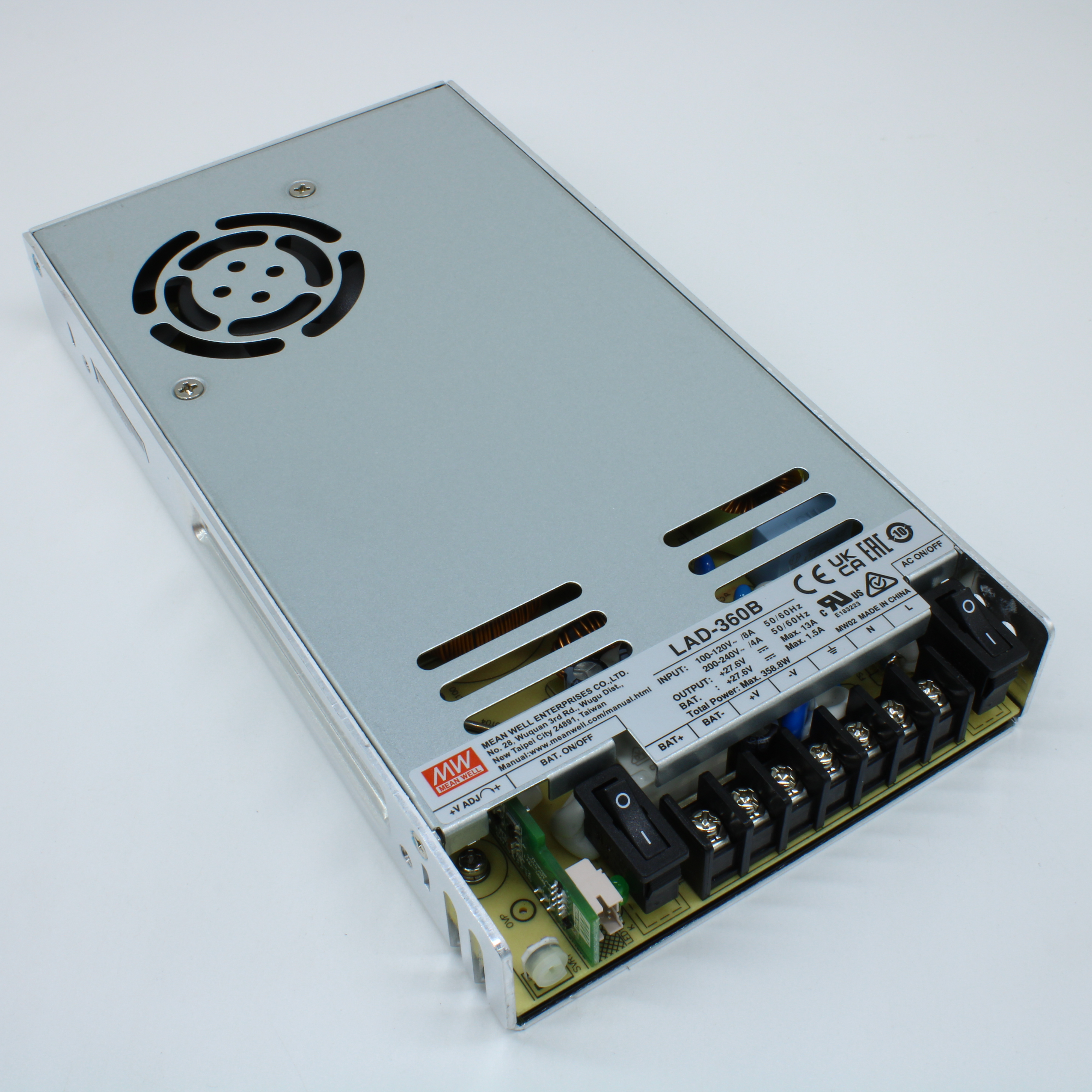LAD-360B - AC-DC с функцией заряда АКБ, 358.8Вт, вход 90…132/180…264В AC, 47…63Гц /240…370В DC, вых1: 27.6В(21.6…29В)/11.5A, вых2: 27.6В/1.5A (заряд), изоляция 3000В AC, в кожухе 215х115х30мм, -20…+60°С, состояние по TTL