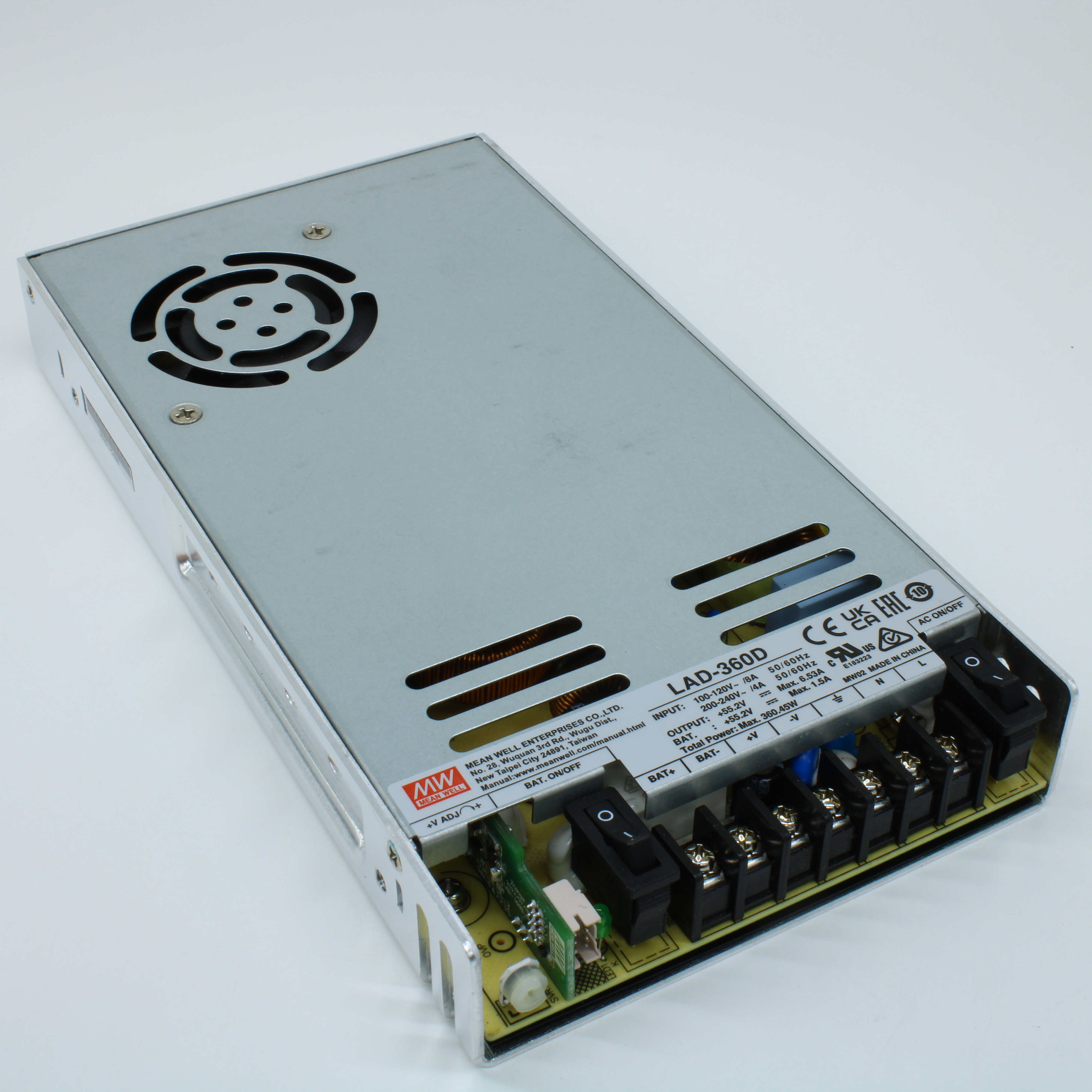 LAD-360D - AC-DC с функцией заряда АКБ, 360.46Вт, вход 90…132/180…264В AC, 47…63Гц /240…370В DC, вых1: 55.2В(43.5…58В)/5.03A, вых2: 55.5/1.5A (заряд), изоляция 3000В AC, в кожухе 215х115х30мм, -20…+60°С, состояние по TTL