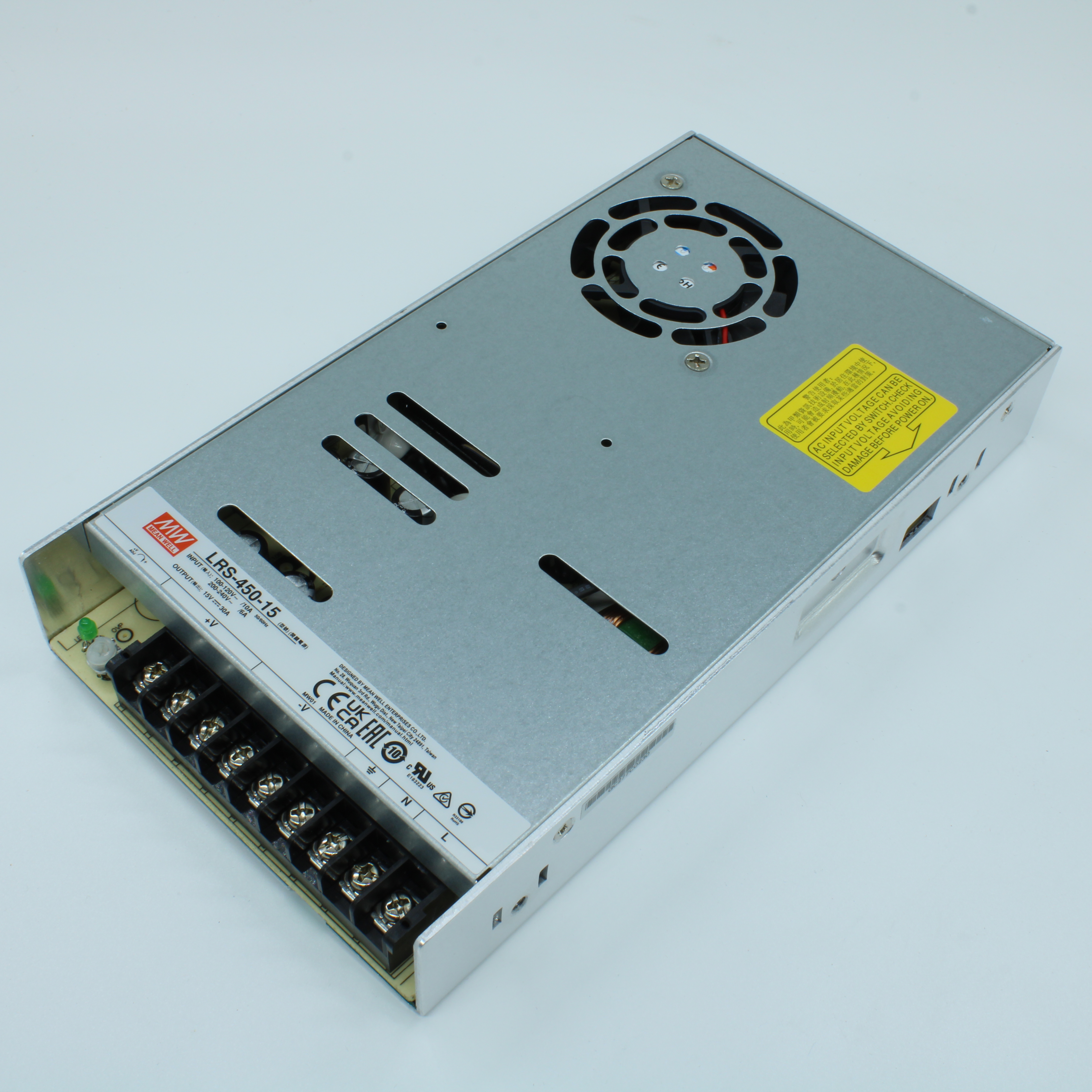 LRS-450-15 - AC-DC, 450Вт, вход 90…264В AC (переключатель), 47…63Гц, выход 15В/30A, рег.вых=14.25…16.5В, изоляция 3000В AC, в кожухе 225х124х35мм, -25…+70°С
