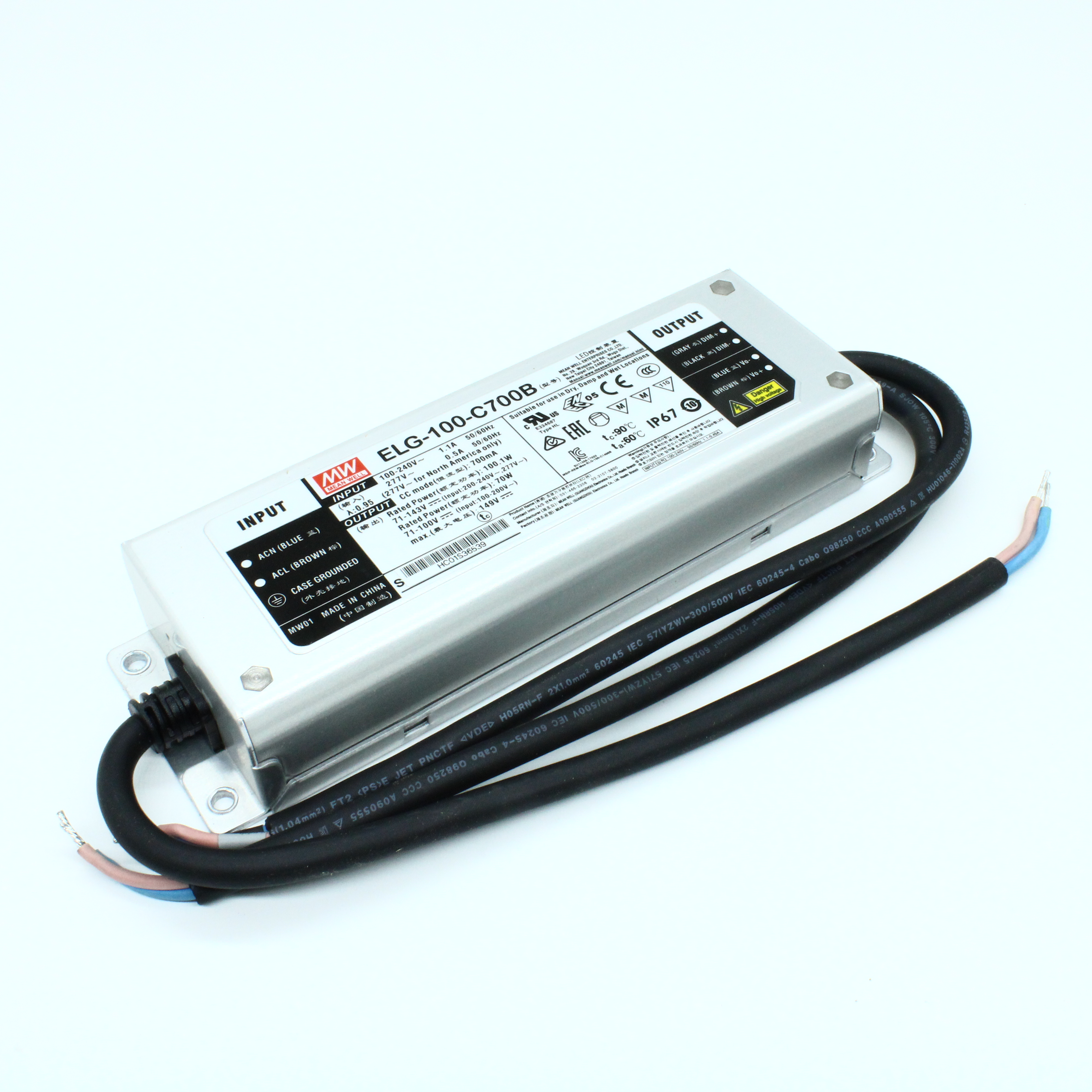 ELG-100-C700B - AC-DC, 100.1Вт, IP67, вход 100…305В AC, 47…63Гц/142…431В DC, ККМ, выход 71…143В/700мА, изоляция 3750В AC, в кожухе 199х63х35.5, -40…+70°С, димминг 3 в 1