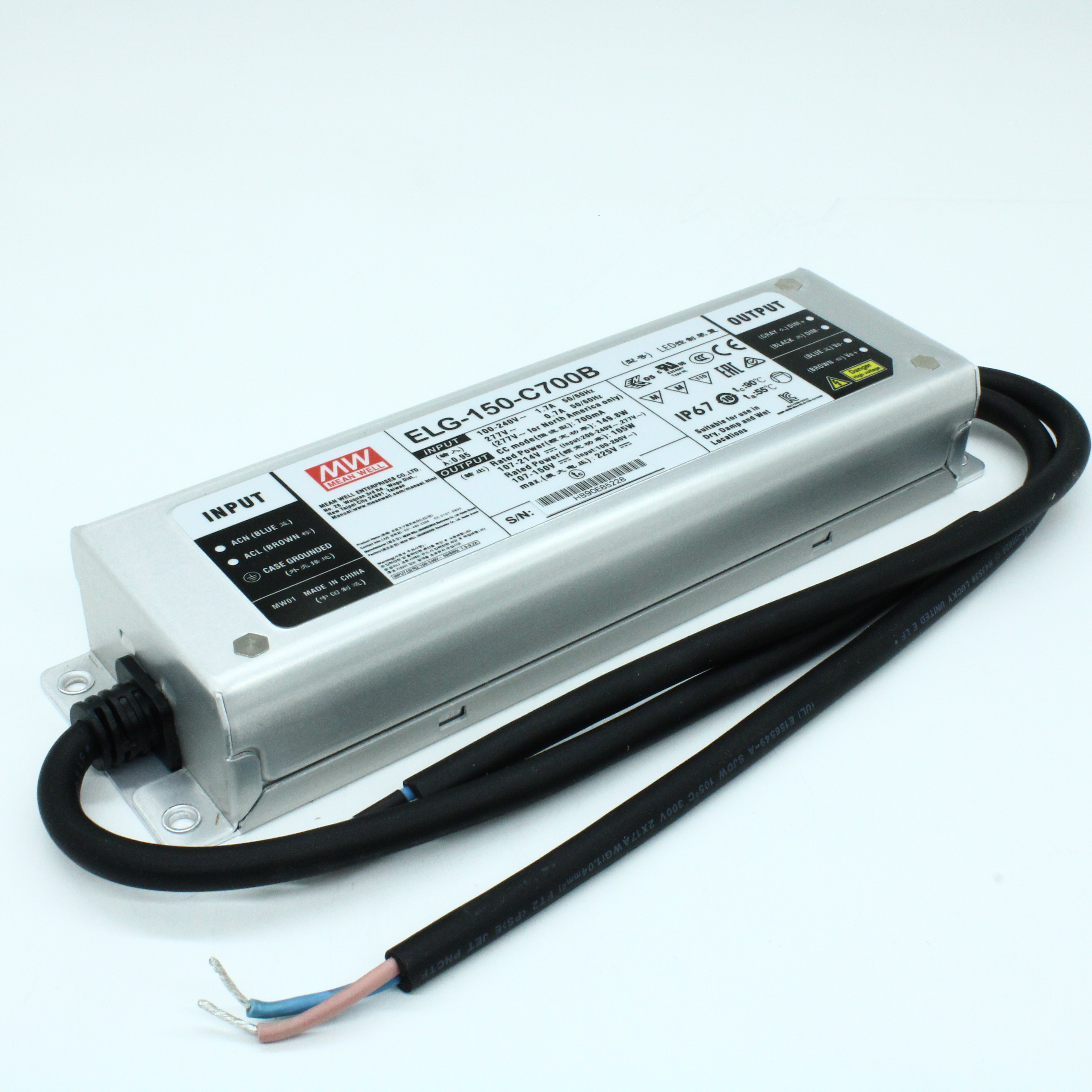 ELG-150-C700B - AC-DC, 149.8Вт, IP67, вход 100…305В AC, 47…63Гц/142…431В DC, ККМ, выход 107…214В/700мА, димминг 3 в 1, изоляция 3750В AC, в кожухе 219х63х35.5, -40…+70°С, провод заземления