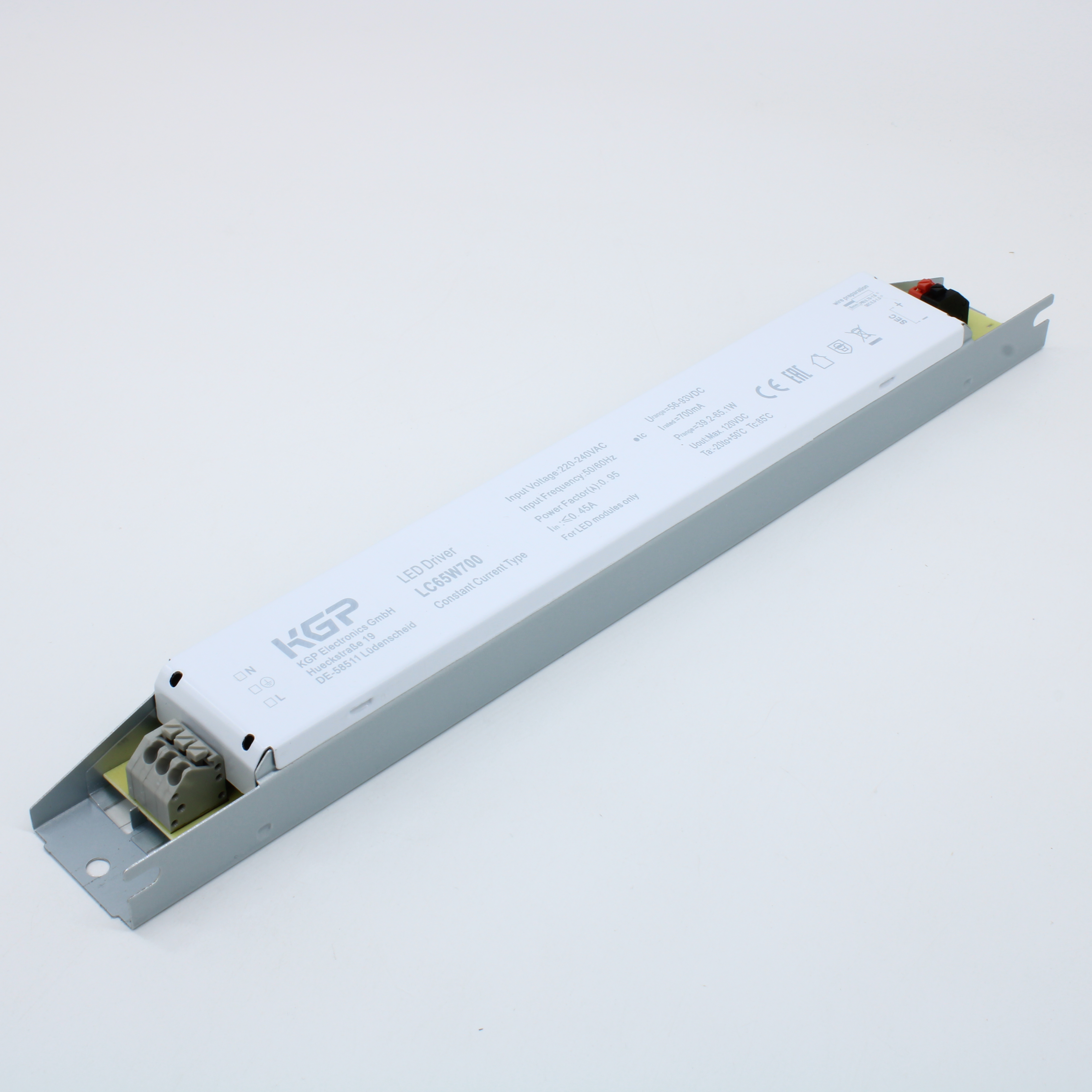 LC65W700 - AC-DC, 65Вт, стаб.тока, вход 176…264В AC, 50/60Гц, 176…280В DC, выход 700мA/56…93В, ККМ, изоляция 3000В AC/1мин, в кожухе 250х30х21мм, -20…+50°С, IP20, защиты SCP, OLP, NLP (все с автовосстановлением)