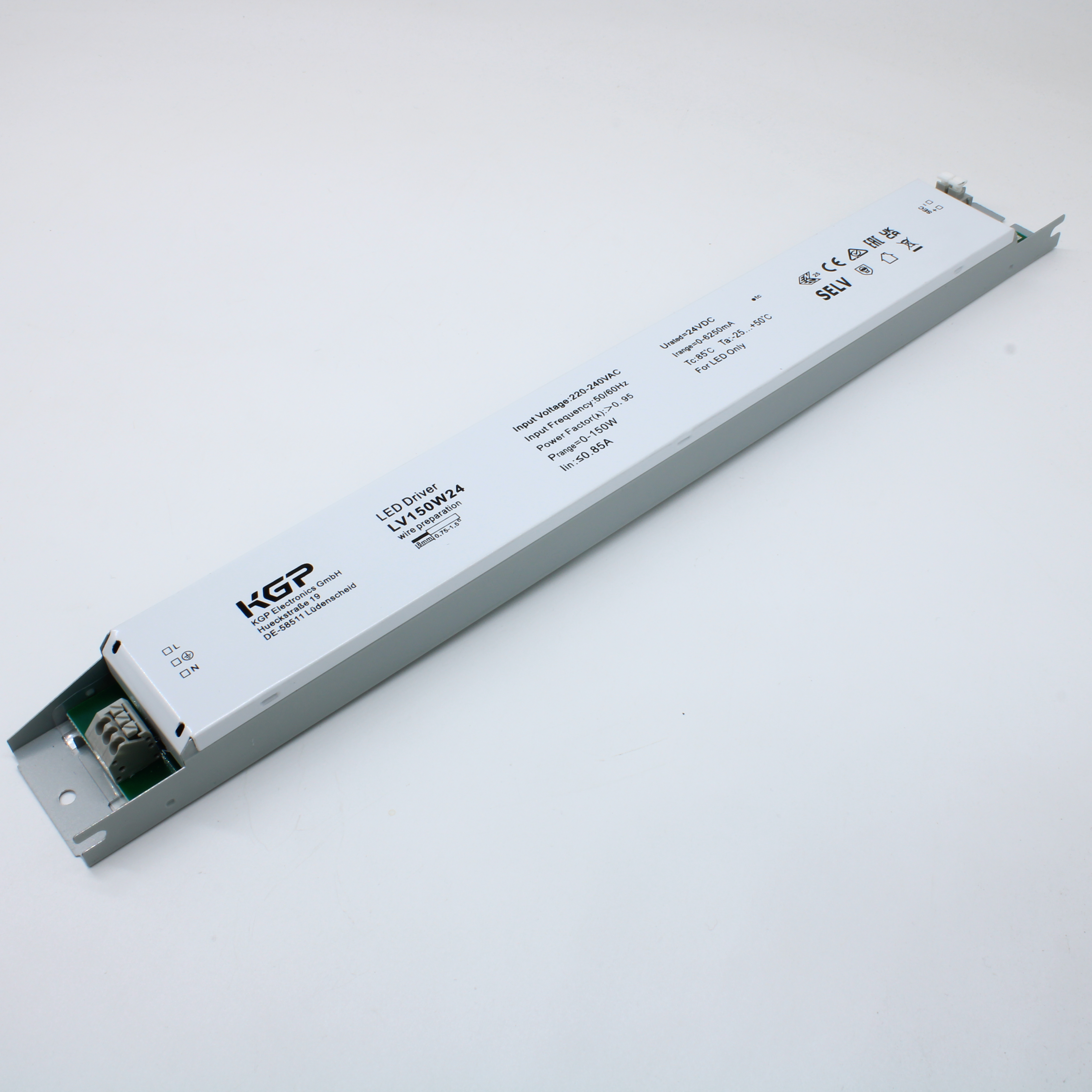 LV150W24 - AC-DC, 150Вт, IP20, вход 176…264В AC/170-275VDC, выход 24В/6,25А, ККМ (PF?0.95), изоляция 1кВ, пластиковый корпус 360*40*21mm, -25…+50°С