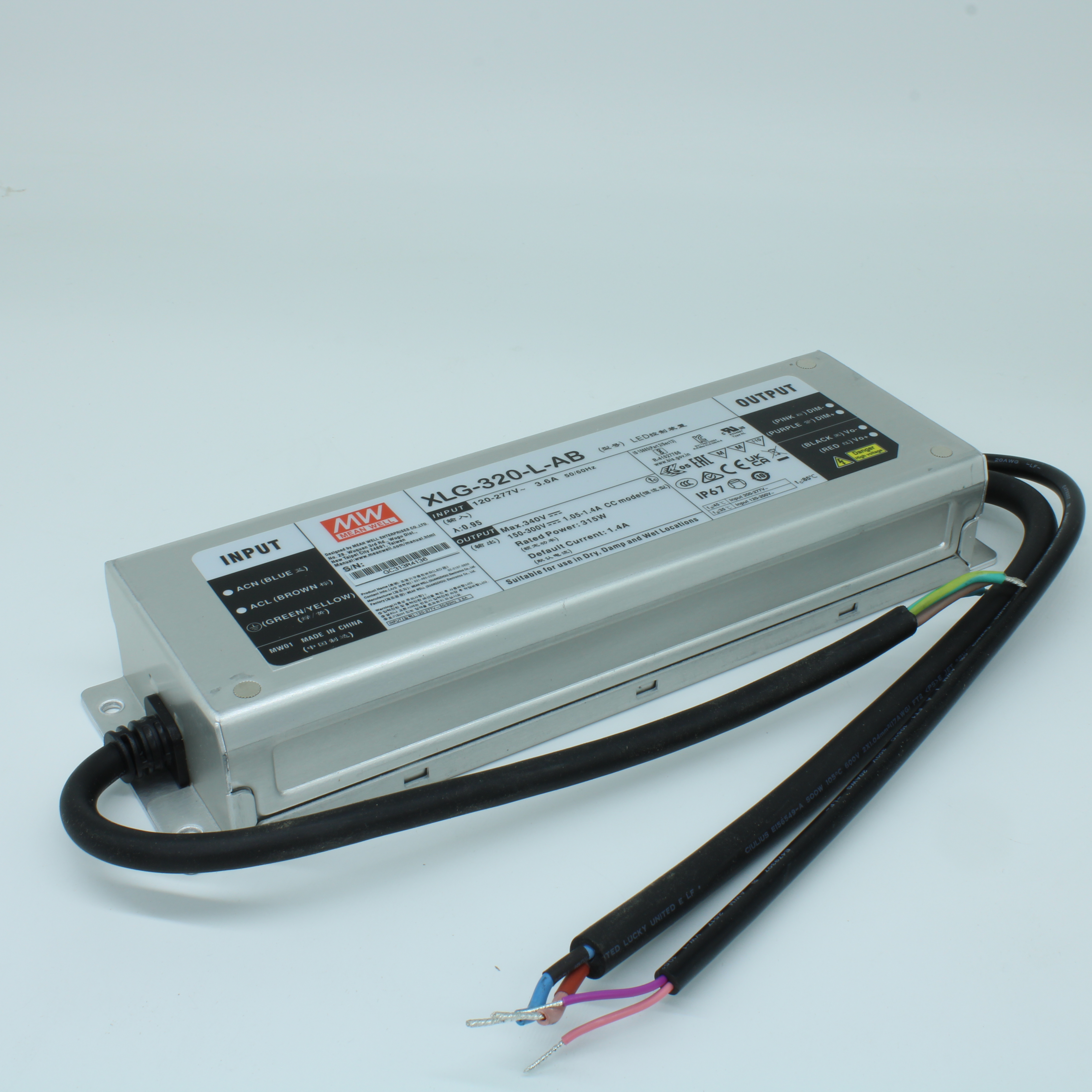 XLG-320-L-AB - AC-DC, 315Вт, стабилизатор тока, IP67, вход 100…305В AC, 47…63Гц, ККМ, выход 1400(500…1400)мА/150…300В, изоляция 3750В AC, в кожухе 246х77х39.5мм, -40…+85°С (корпус), встр. потенциометр, димминг 3 в 1