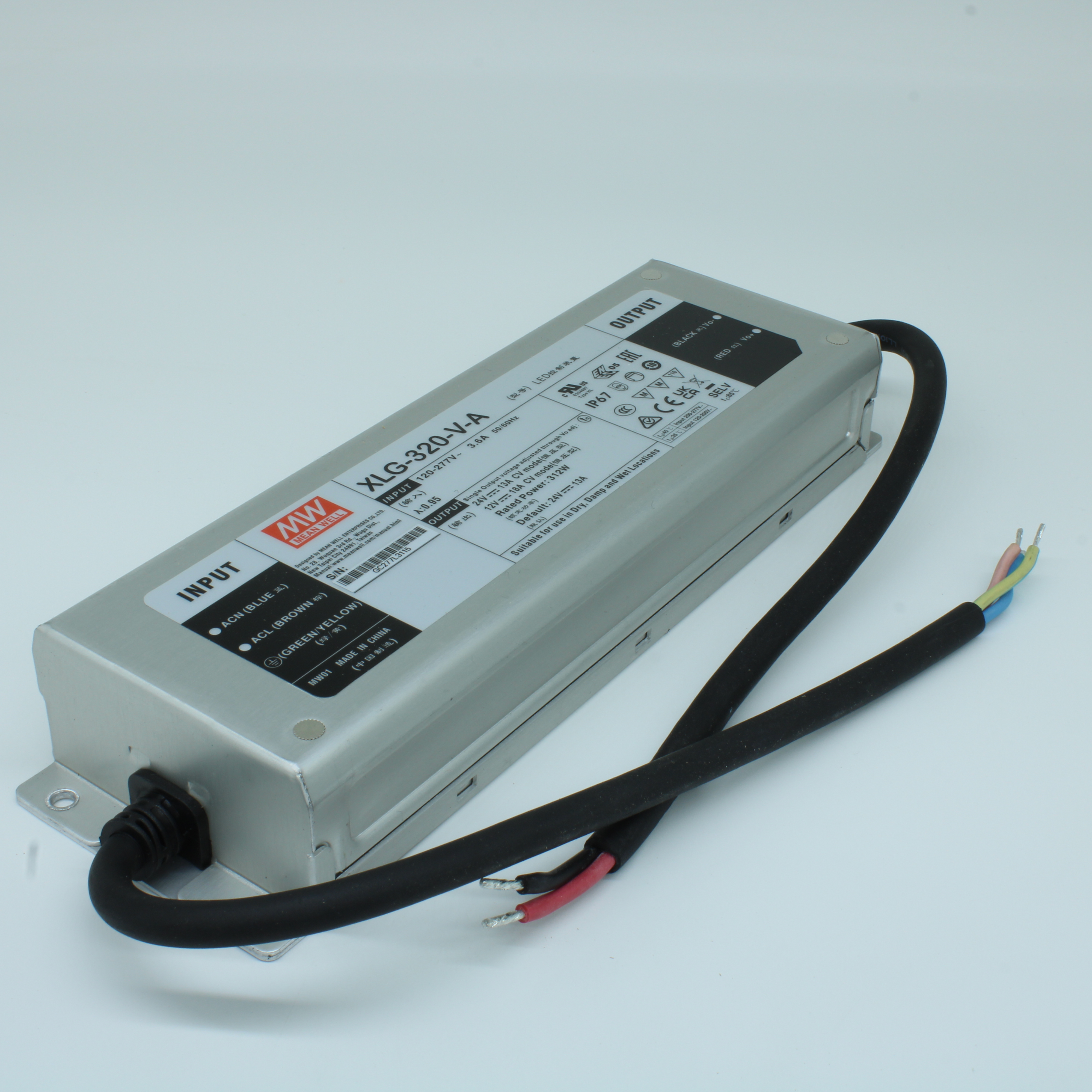 XLG-320-V-A - AC-DC, 216…312Вт, IP67, вход 100…305В AC, 47…63Гц, ККМ, выход 12…24В(рег)/13А(при 24В)…18В(при 12В), изоляция 3750В AC, в кожухе 246х77х39.5мм, -40…+85°С (корпус), встр. потенциометр