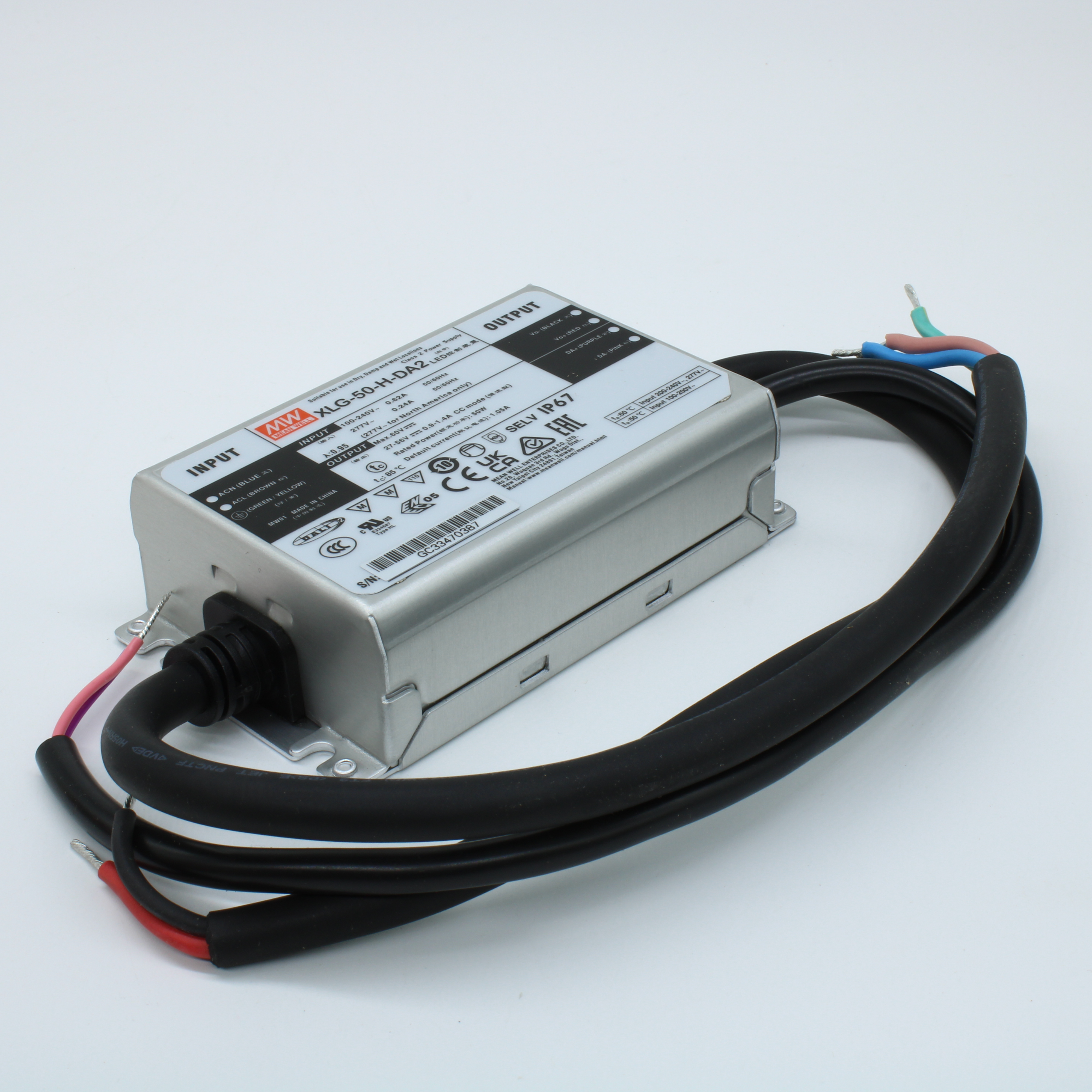 XLG-50-H-DA2 - AC-DC, 50Вт, вход 90…305В AC, 47…63Гц/127…431В DC, выход 27…56В/1050мА, рег. вых 500…1400мА, изоляция 3750В AC, в корпусе 105х63х30мм, -40…+85°С, DALI-2 димминг