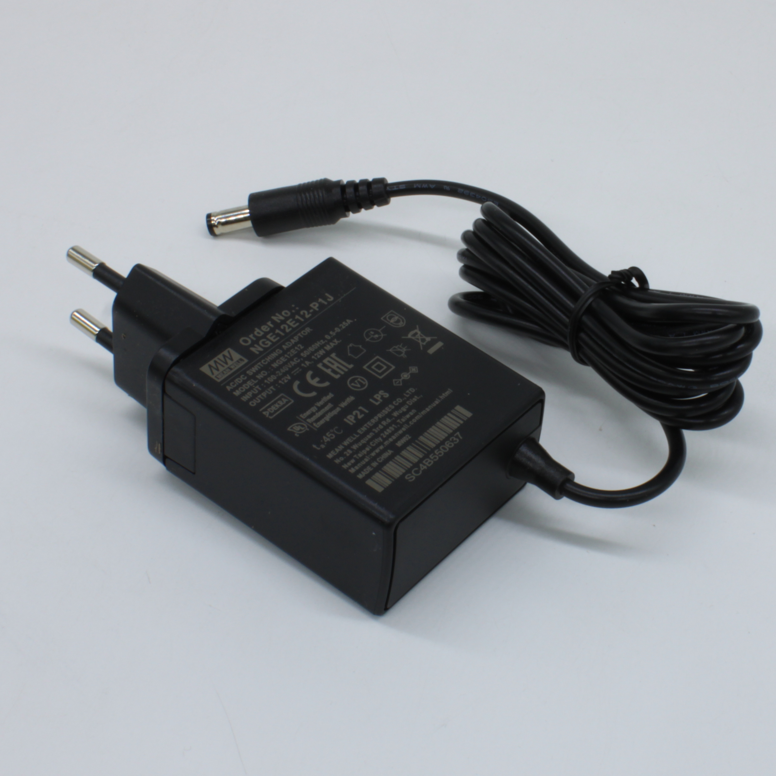 NGE12E12-P1J - AC-DC, 12Вт, сетевой адаптер, выход 12В/1А, вход 80...264В AC, 47...63 Гц, изоляция 4000B DC, 2xMOPP, 48x28*x55мм, -30...+70C, евровилка, выходной разъем 11мм, диам. 5.5х2.1мм