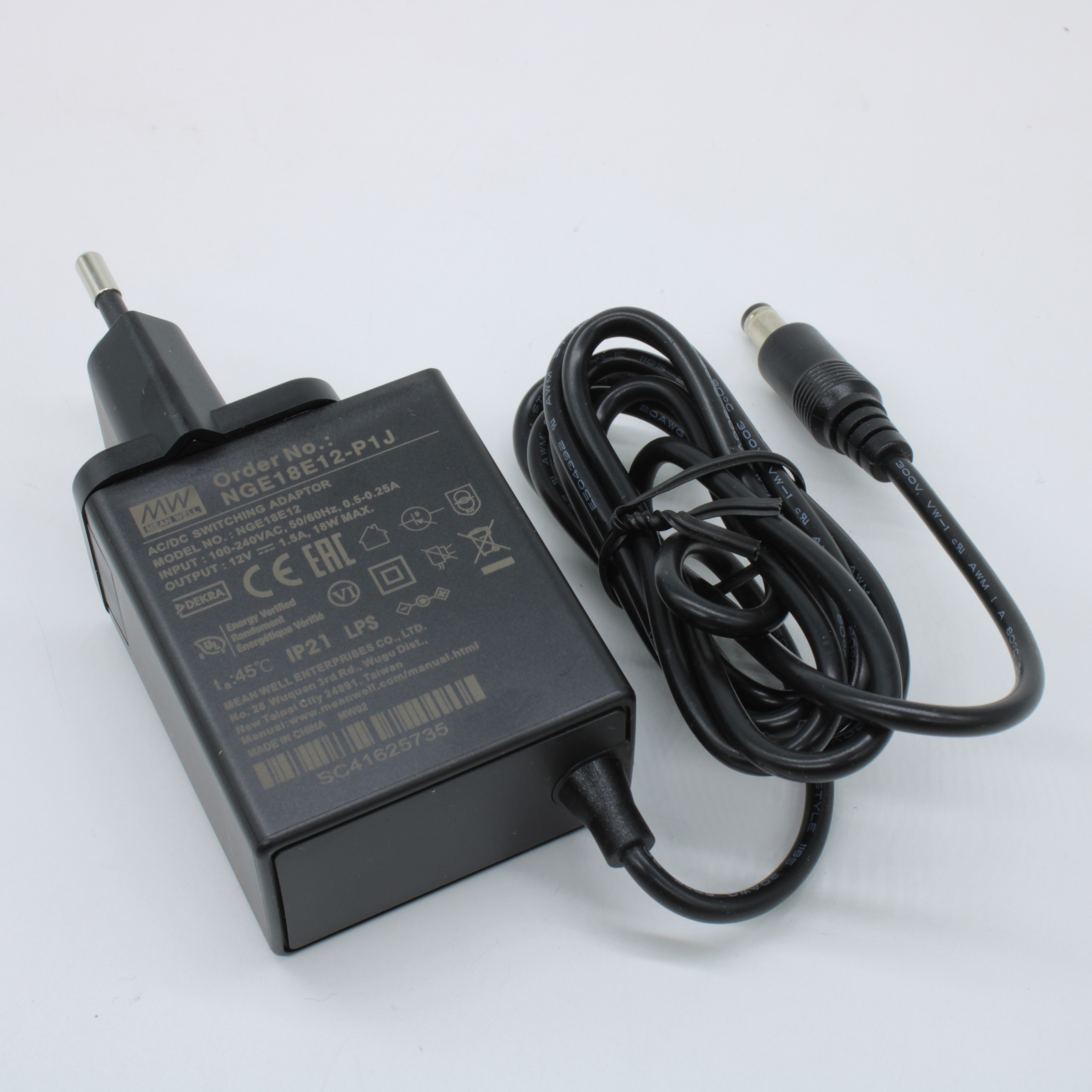 NGE18E12-P1J - AC-DC, 18Вт, сетевой адаптер, выход 12В/1.5А, вход 80...264В AC, 47...63 Гц, изоляция 4000B DC, 2xMOPP, 48x28*x55мм, -30...+70C, евровилка, выходной разъем 11мм, диам. 5.5х2.1мм