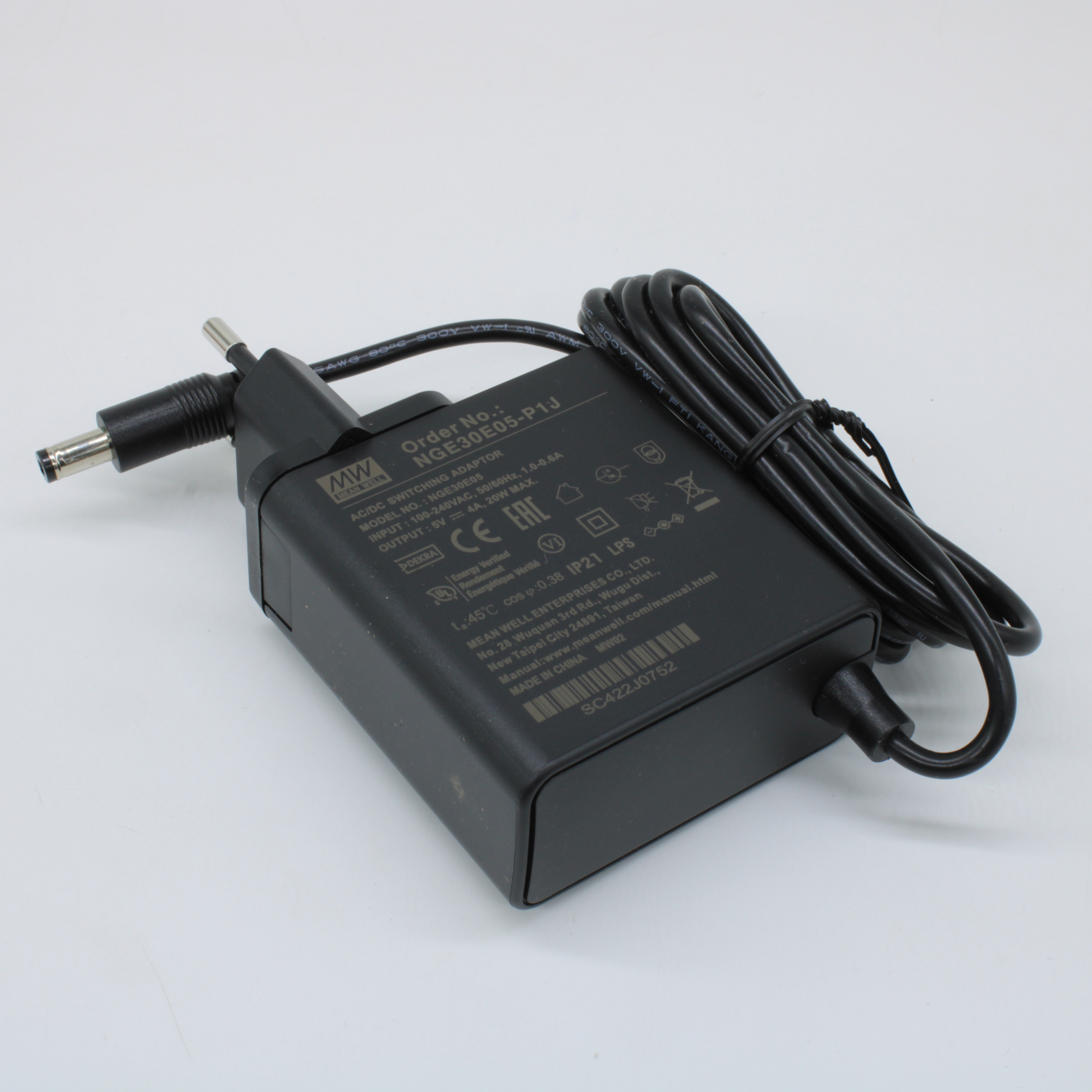 NGE30E05-P1J - AC-DC, 20Вт, сетевой адаптер, выход 5В/4А, вход 80...264В AC, 47...63 Гц, изоляция 4000B DC, 2xMOPP, 62x30*x65мм, -30...+70C, евровилка, выходной разъем 11мм, диам. 5.5х2.1мм