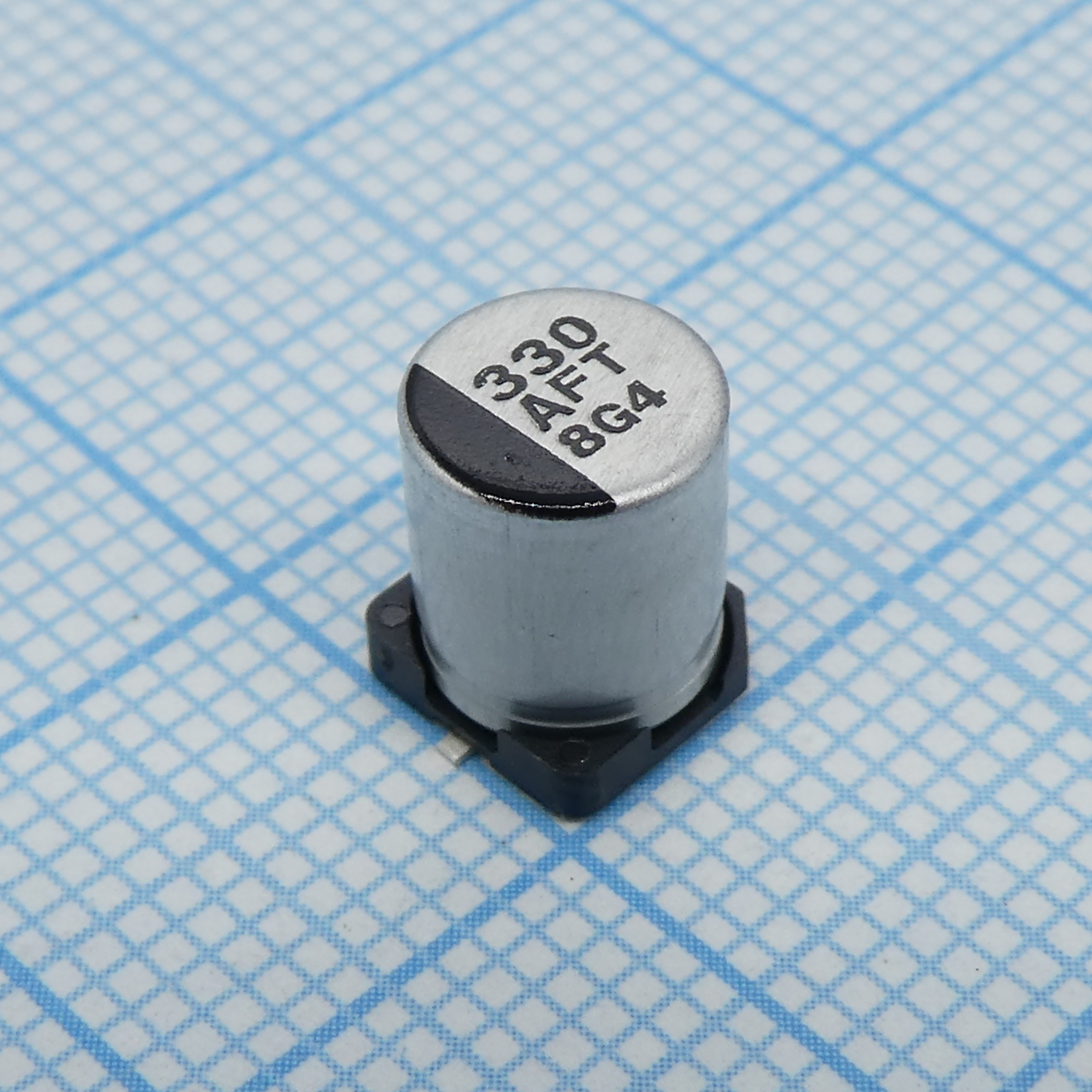 Конденсатор алюминиевый электролитический 330мкФ 10В ±20% (6.3 X 7.7мм) для поверхностного монтажа 0.16 Ом 600мА 2000час 105°С автомобильного применения лента на катушке