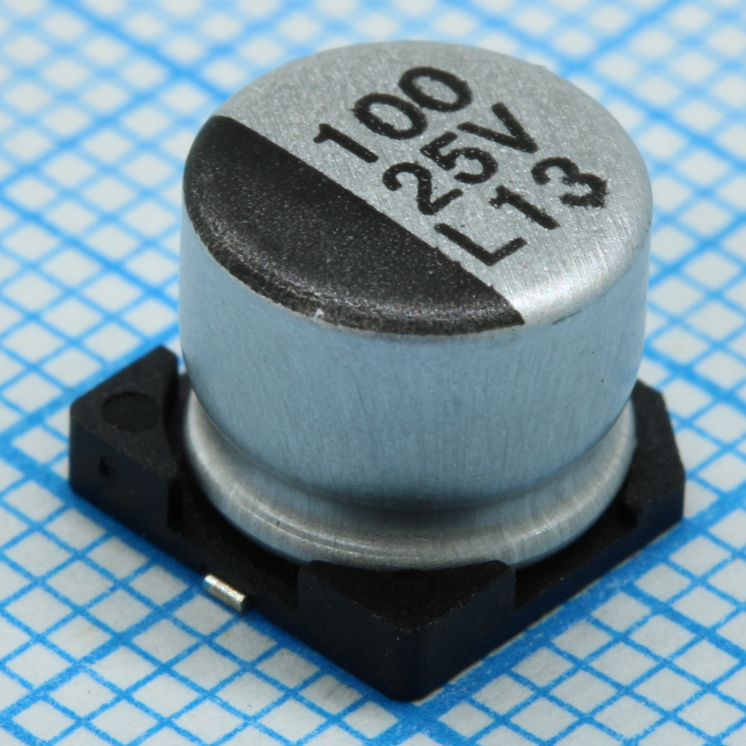 Конденсатор алюминиевый электролитический 100мкФ 25В ±20% (8х6.5мм) для поверхностного монтажа 160мА 2000час 85°С лента на катушке
