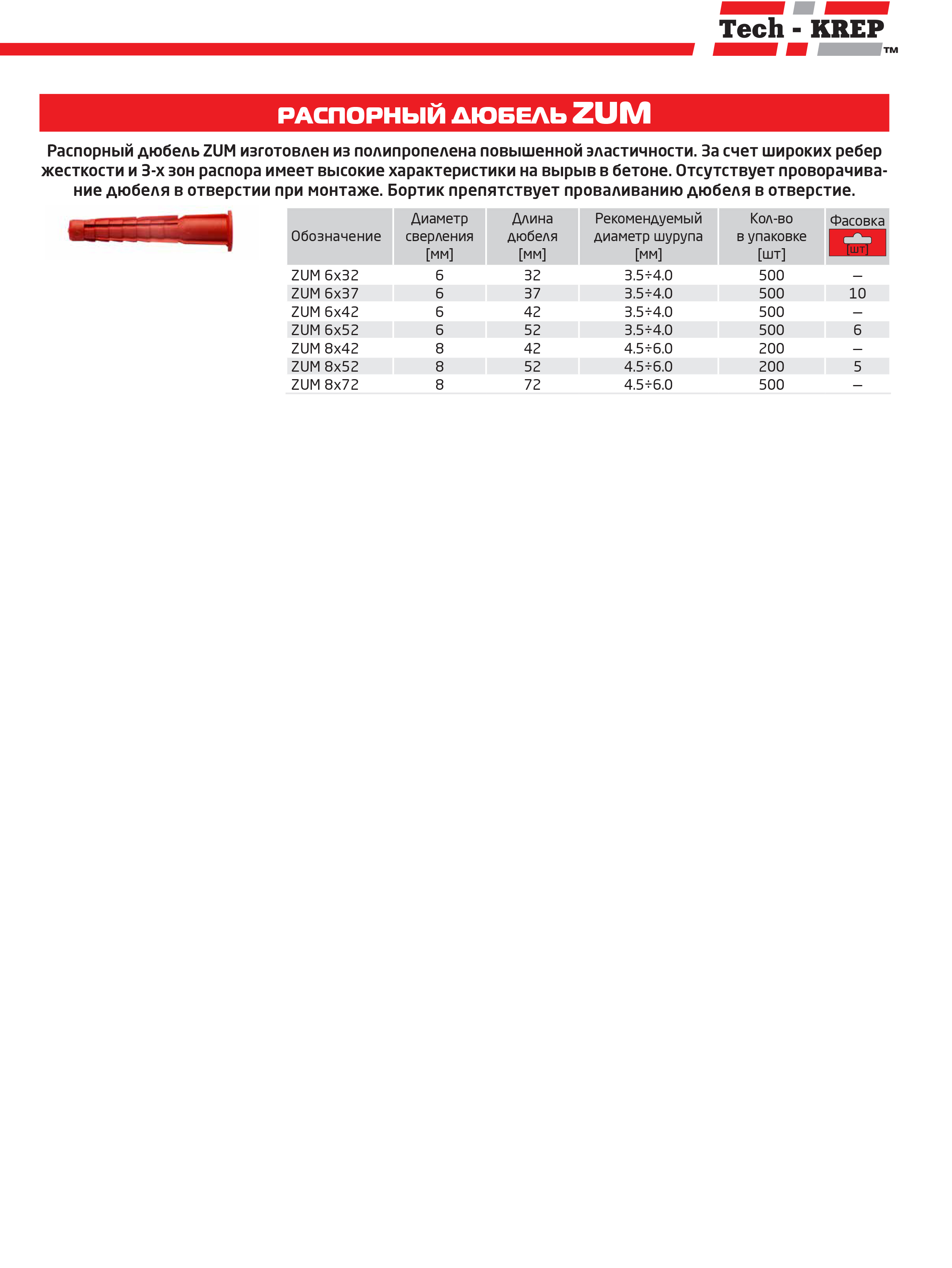 Дюбель универс. 6х37 полипропилен (уп.30шт) пакет Tech-Krep 102929