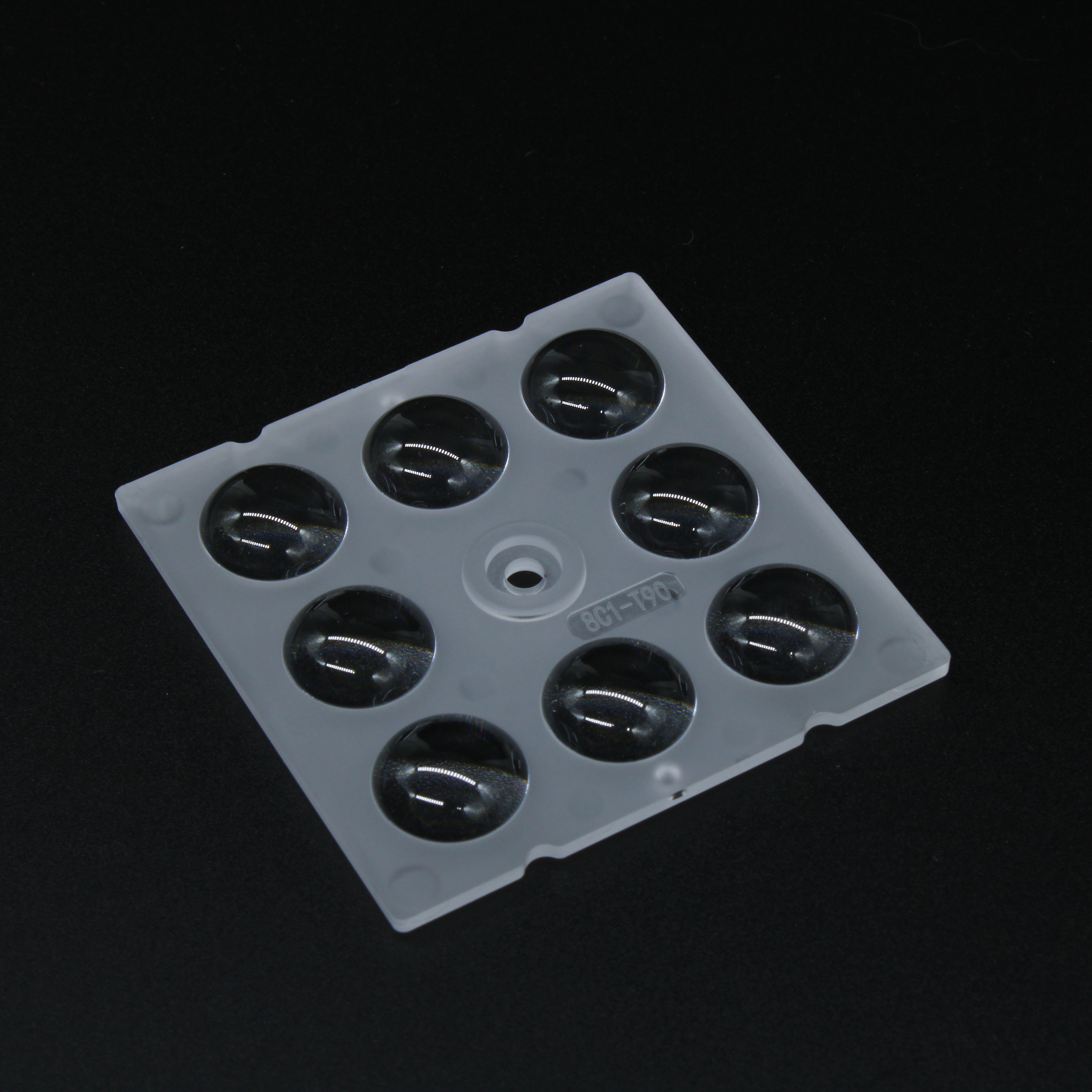 AJHB50D8LED90G - Групповая квадратная линза на 8 светодиодов 5050/3535/3030 , эфф=89%, ~90°, 50x50mm H:6.2mm, PC
