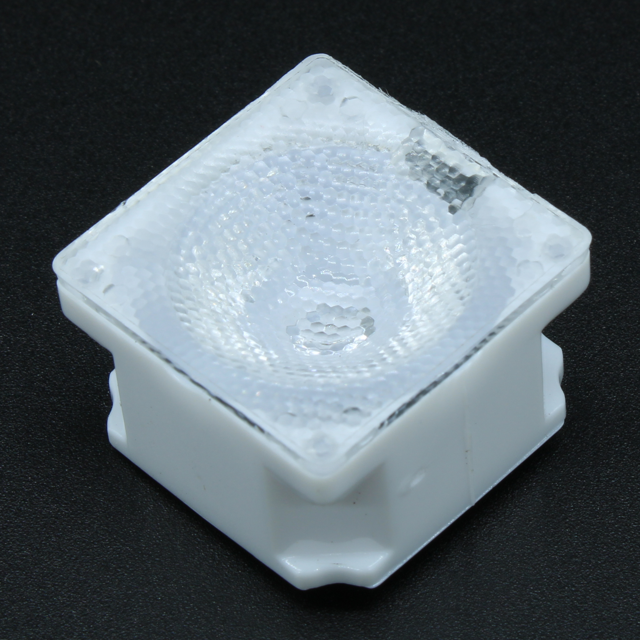 AY22D13H45G-P - Линза белая с клеевой основой для светодиода 3535/3030, ~45°, 21,57x21,57mm H:13mm, с пинами, PMMA