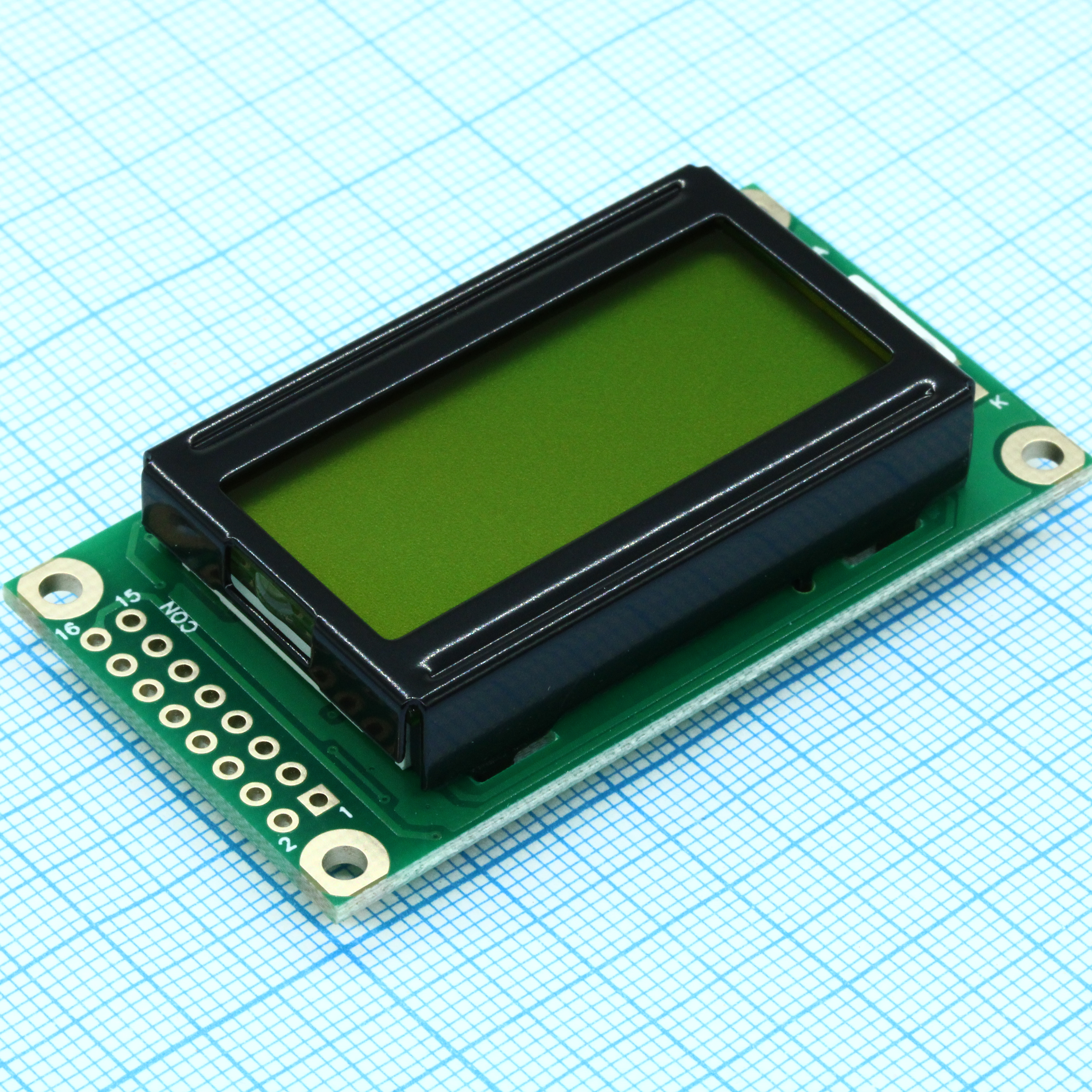 ЖКИ знакосинтезирующий 8 x 2, STN Желто-зеленый Позитивный/прозрачно-отражающий светодиодная подсветка желто-зеленая интерфейс 6800, размер 58x32 мм, видимая область 38х16 мм, питание 5В, -20...70°C, контактные площадки 2 ряда слева 16 выводов