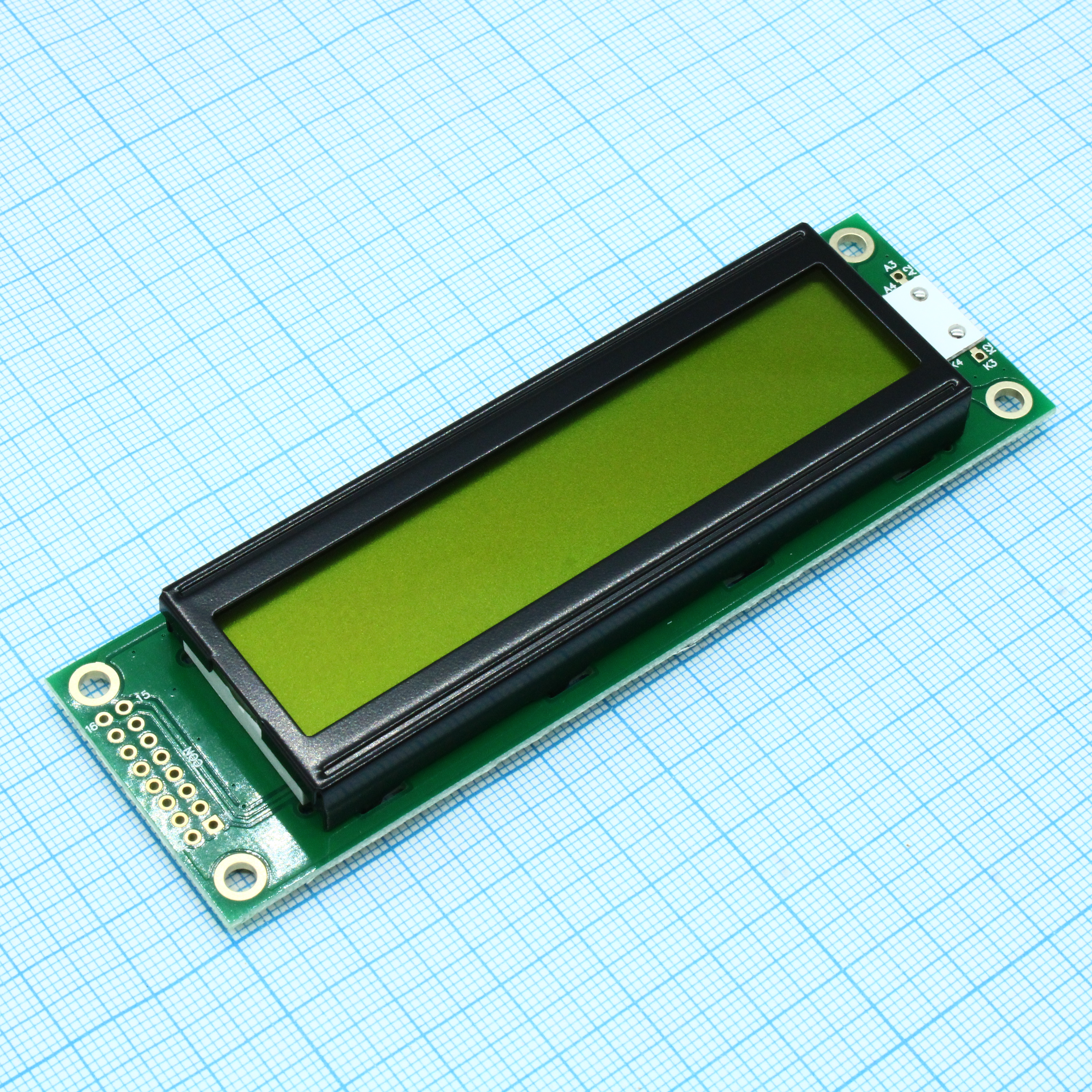 ЖКИ знакосинтезирующий 20 x 2, STN Желто-зеленый Позитивный/прозрачно-отражающий светодиодная подсветка желто-зеленая размеры 116x37 мм, видимая область 85x18.6 мм, -20...70°C, контактные площадки 2 ряда слева 16 выводов