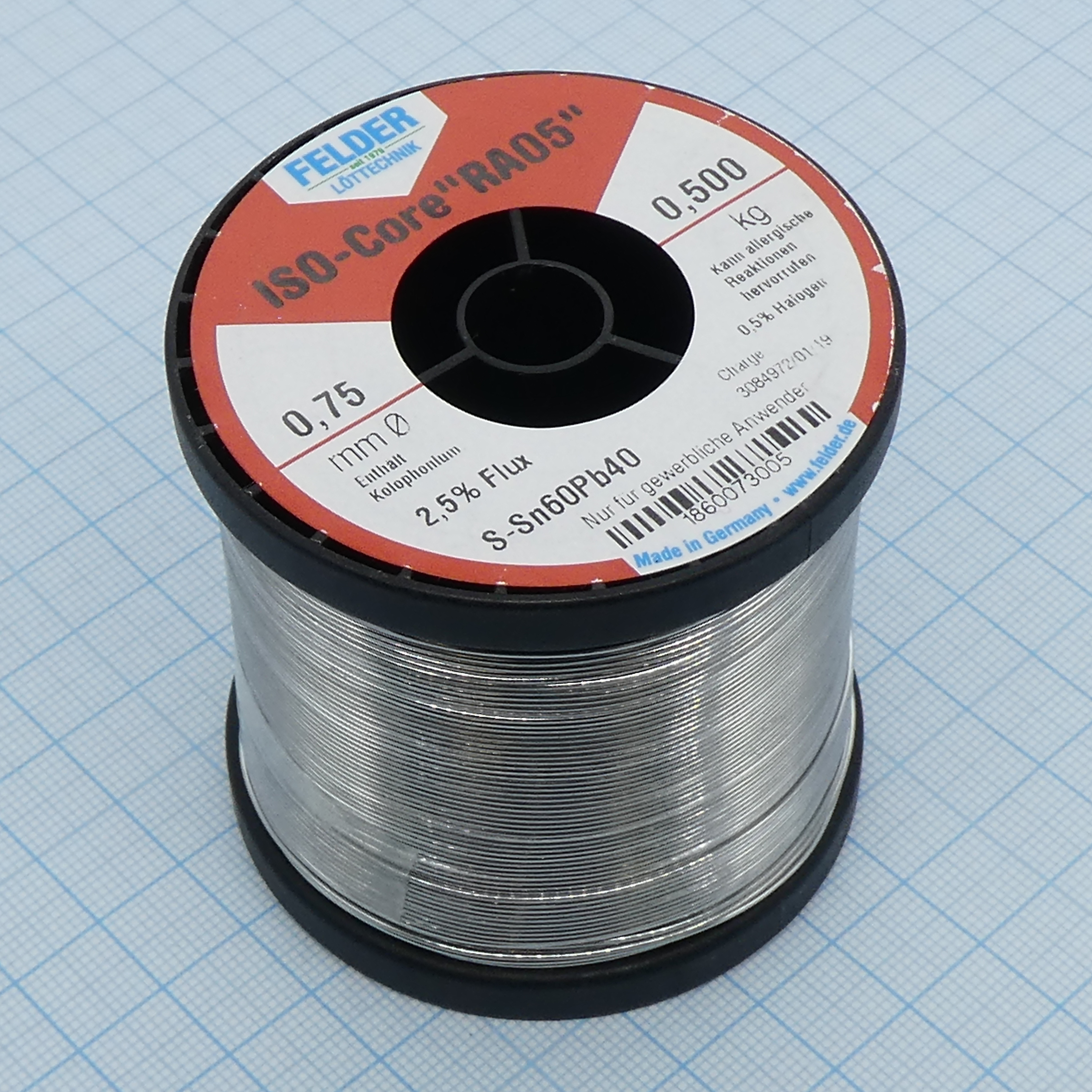 Припой Sn60Pb40 RA05 0.75мм 500гр - Припой трубчатый оловянно-свинцовый ПОС61, 2.5% флюс RA05 активный с низким содержанием галогенов (ROM1)