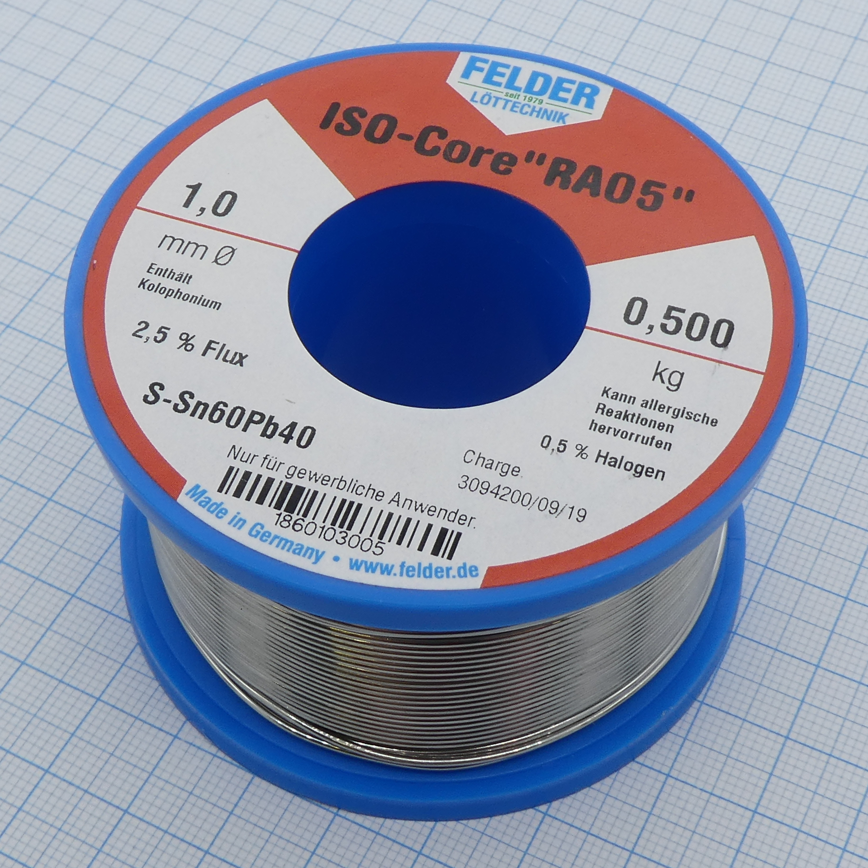 Припой Sn60Pb40 RA05 1.0мм 500гр - Припой трубчатый оловянно-свинцовый ПОС61, 2.5% флюс RA05 активный с низким содержанием галогенов (ROM1)