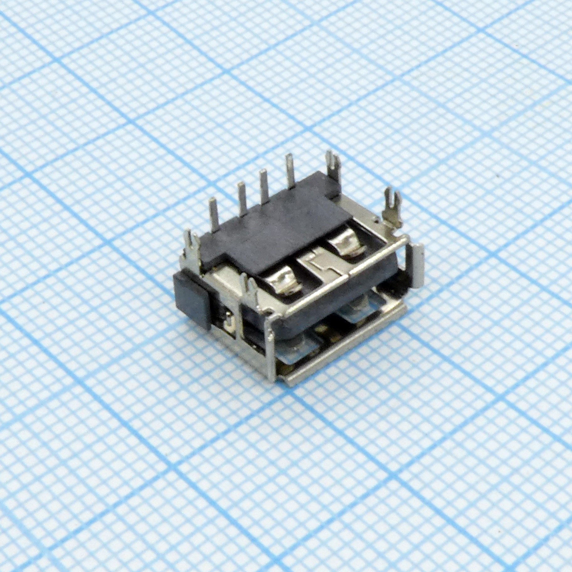 Разъем USB тип A, розетка, 4 контакта на плату, угловой монтаж, реверсивная (площадка с конактами снизу)