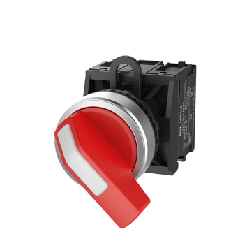 Переключатель, длинная ручка, 3-х позиционный, без самовозврата, без подсветки, алюминиевое переднее кольцо, без контактной группы, диаметр головки кнопки 29,5 мм, диаметр посадочного отверстия: 22 мм, цвет: красный