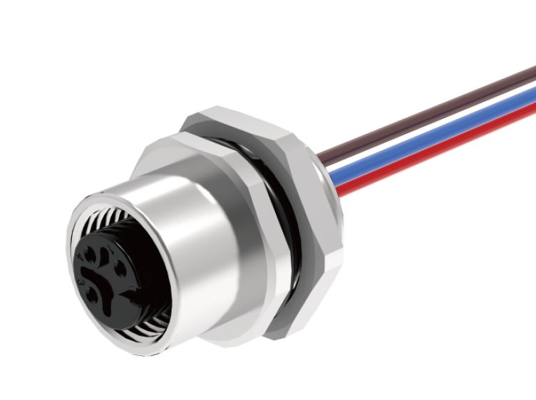 Розеточный разъем в панель, 5 полюсов, M12, гайка сзади, с проводом 0,5 метра, A-Code, 4А, 60V, резьба на гайке PG9, резьбовое соединение: латунь, неэкранированный