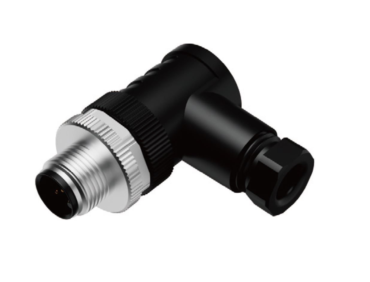 Вилочный разъем на кабель, 4 полюса, M12, угловой, A-Code, диаметр кабеля: 4,0-6,0 мм, 4А, 250V, корпус из пластика, резьбовое соединение: цинк