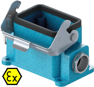 Закрытое основание разъема EX 70.334.0636.0 - Основание разъема на панель, закрытое, типоразмер 6B, взрывозащищита, с уплотнителем, 2 кабельных ввода M25x1,5, IP54, с одной защелкой, без защитной крышки, материал корпуса: цинковый сплав