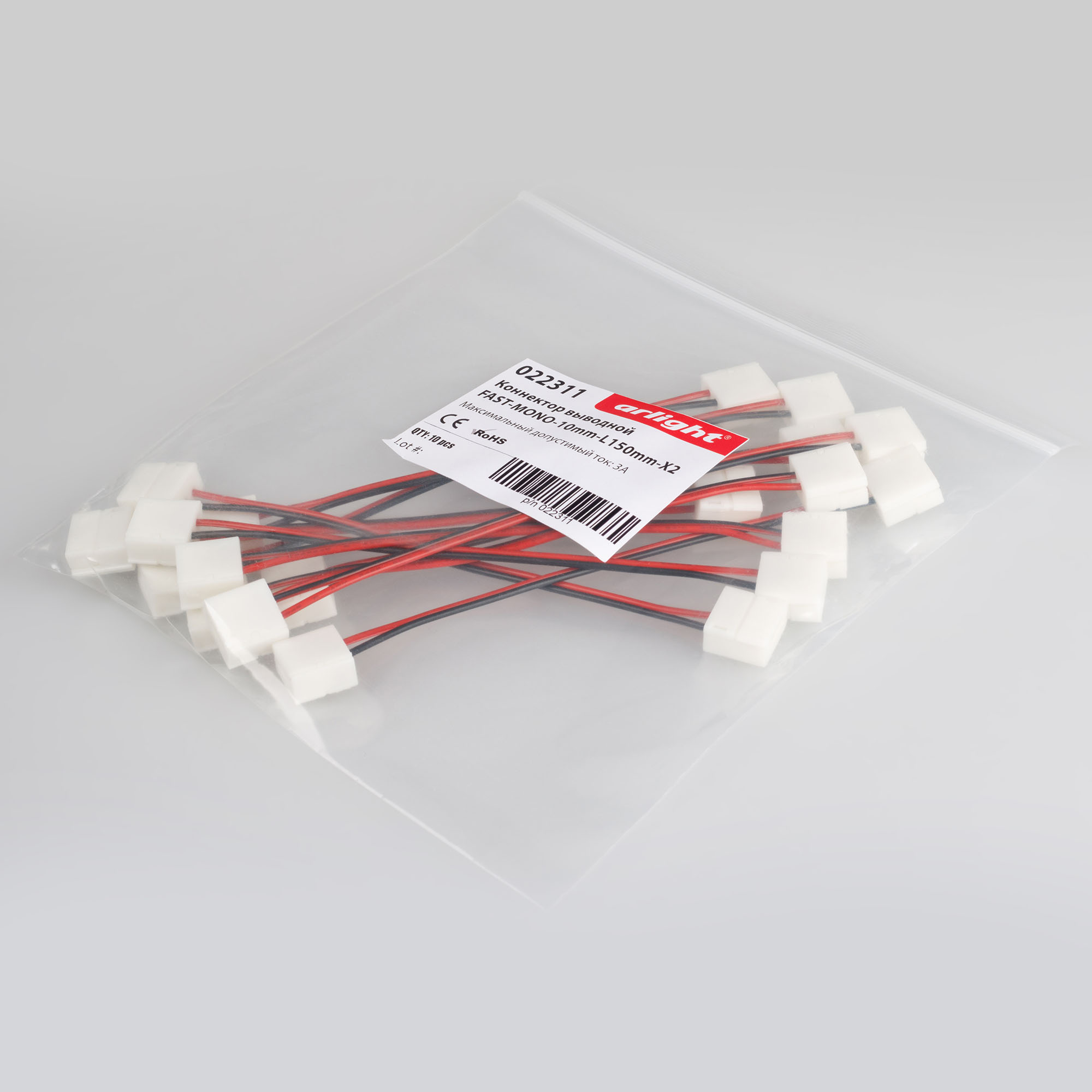 Коннектор выводной FAST-MONO-10mm-L150mm-X2 022311 - Двойной коннектор с проводом 15см для соединения 2-х отрезков ГЕРМЕТИЧНЫХ светодиодных одноцветных лент шириной 10мм. Материал - пластик. Максимальный допустимый ток 3А, напряжение до 50 В. Цена за 1шт.